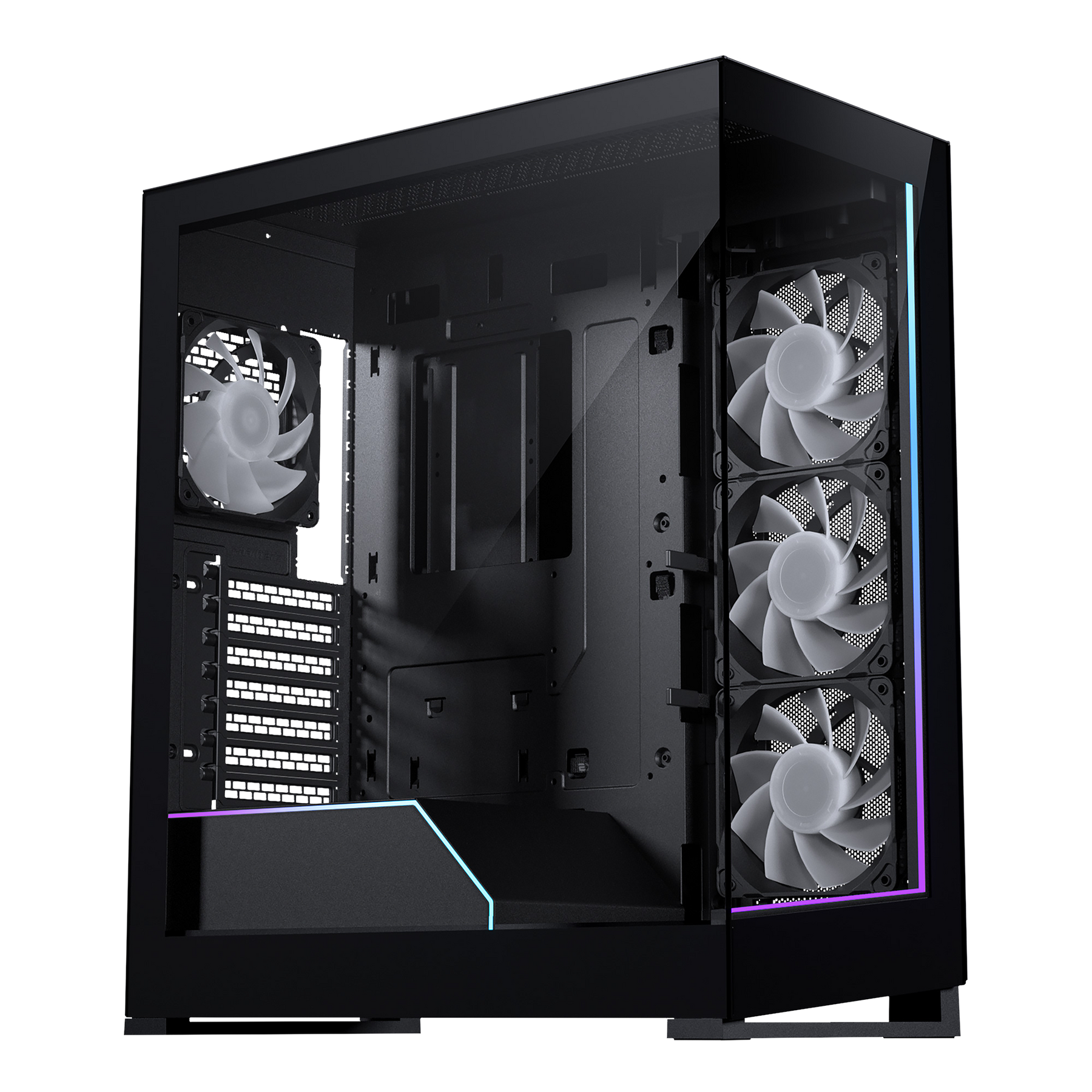 • Near-seamless glass panels for a perfect view of all your system components